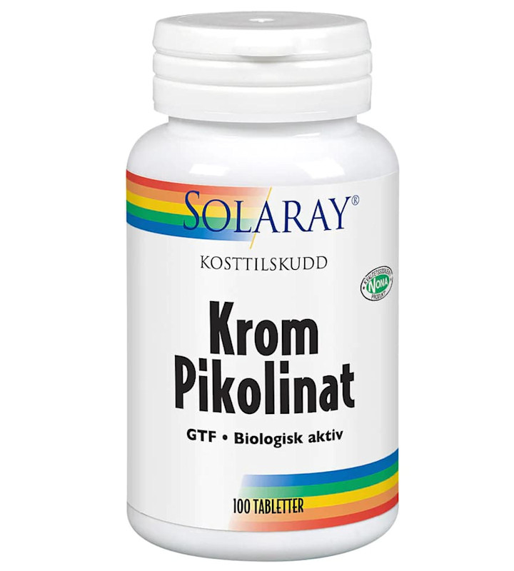 Solaray er en anerkjent produsent av en rekke kosttilskudd og har gjennom flere år vært kjent for å produsere kvalitet. Krom Pikolinat er derfor et trygt valg. Produktet er et treverdig organisk bundet (GTF og biologisk aktivt) kromtilskudd som stabiliserer blodsukkeret og demper søtsuget. Tilskuddet inneholder pikolinsyre for bedre opptak i kroppen. Mens krom vil bidra til normal omsetning av karbohydrater, fett og proteiner og hjelpestoffet GTF (glukosetoleransefaktor) vil bidra til å regulere blodsukkeret i samspill med insulin. Produktet er vegetabilsk og fritt for gjær. Anbefalt daglig dose er 1 tablett daglig sammen med mat og et variert kosthold.